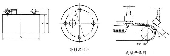 項目 | 冷卻方式(shi) | 適(shi)應帶寬 mm | 額定高度 mm | 磁場強度 mT | 勵磁功(gong)率 kw | 適應帶速 ≤m/s | 外形尺寸mm φD×B | 重量 | |